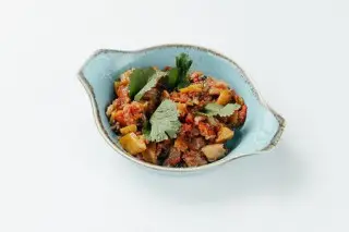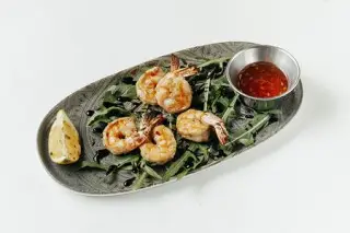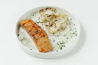 Стейк из красной рыбы на мангале с цветной капустой под сырно-лаймовым соусом